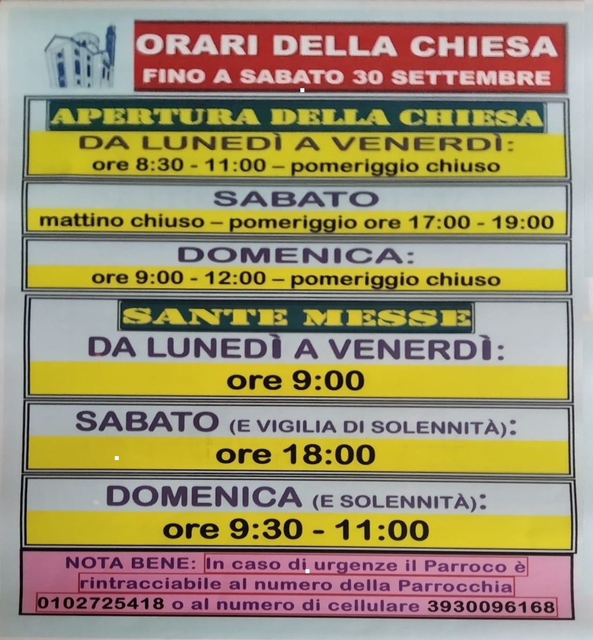 N.B. Il Parroco è sempre disponibile e rintracciabile allo 0102725418 o